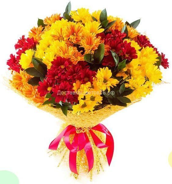 Состав: желтые, оранжевые, бордовые хризантемы, зелень рускуса, упаковка, лента.