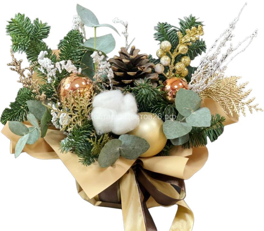 Открытка в подарок. SMS информирование о статусеСостав: ветки хвои, шишики, эвкалипт, хлопок натуральный, декоративные ягоды, упаковка, ленты атласные двух цветов, флорекс.