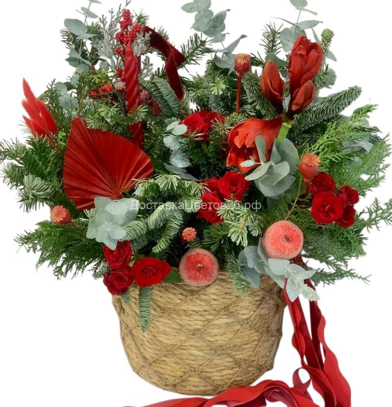 Открытка в подарок. SMS информирование о статусеСостав: амариллис красный - 1 ветка, роза кустовая красная - 3 ветки, свеча, эвкалипт, натуральные ветки хвои, декоративные фрукты и ягоды, декор новогодний, колосья, ленты атласные, флорекс, кашпо плетенное.